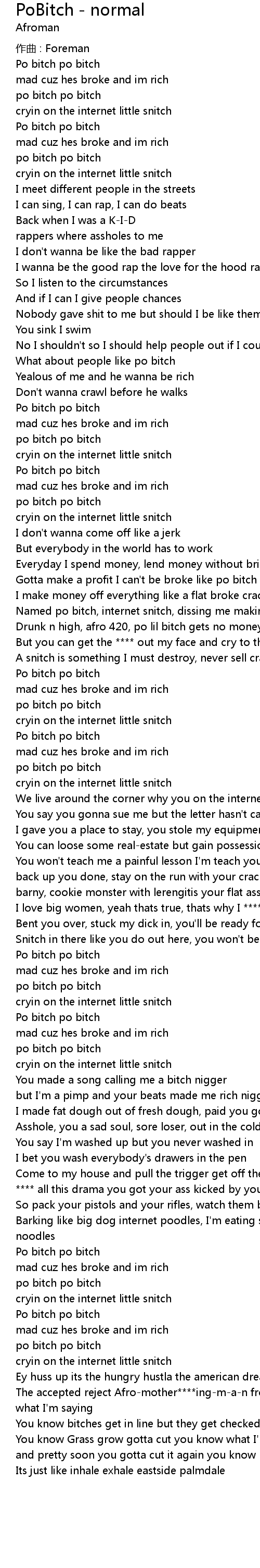 | Gotta make a profit I can't be broke like po bitch is with no crack to smoke | |