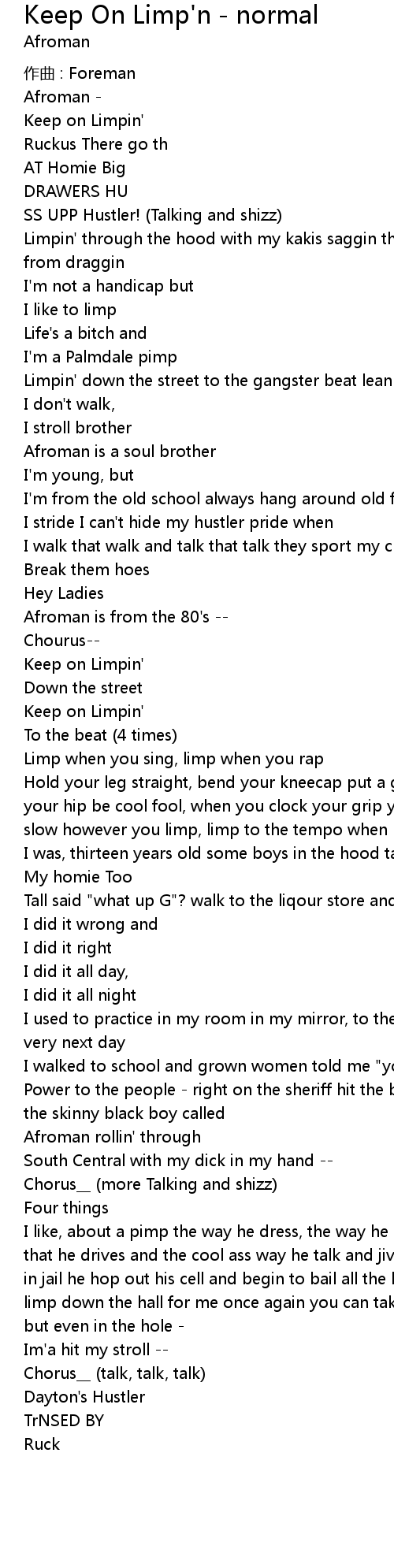 | Hold your leg straight, bend your kneecap put a glide in your stride, dip in your hip be cool fool, when you clock your grip you can limp fast, you can limp slow however you limp, limp to the tempo when | |