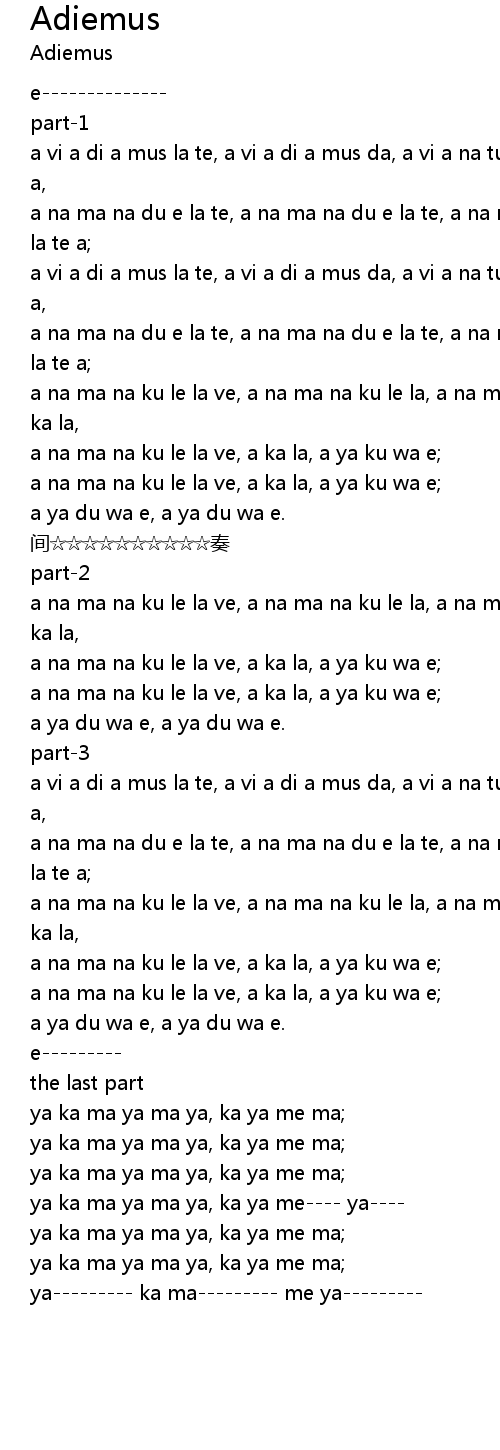 | [00:38.54] | a na ma na du e la te, a na ma na du e la te, a na ma na du e la te, la te a; |