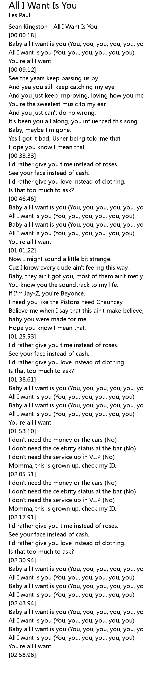 | [00:01.18] | Baby all I want is you You, you, you, you, you, you |