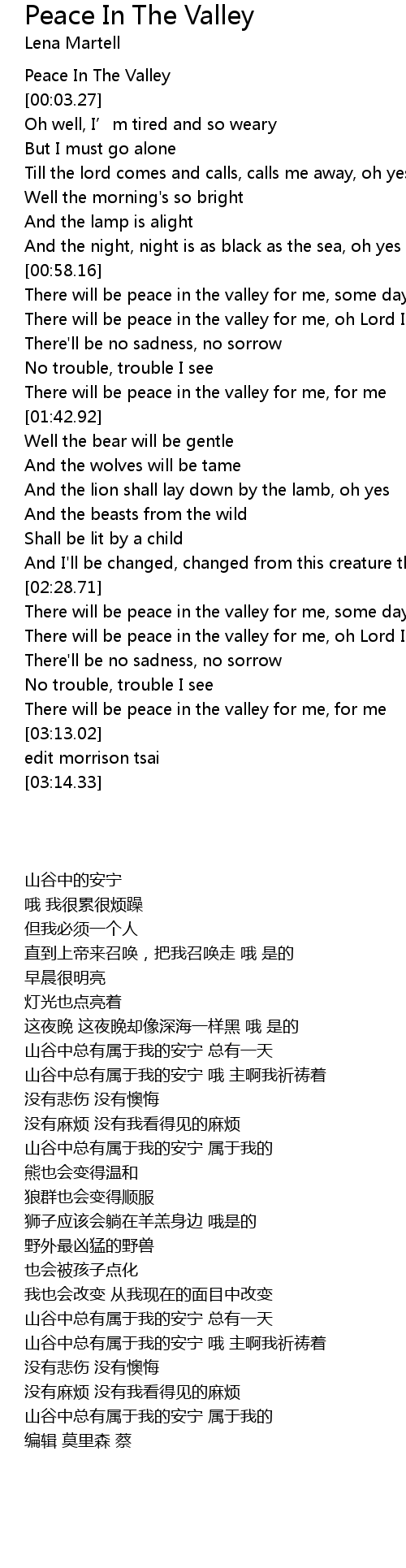 | [03:04.22] | There will be peace in the valley for me, for me |