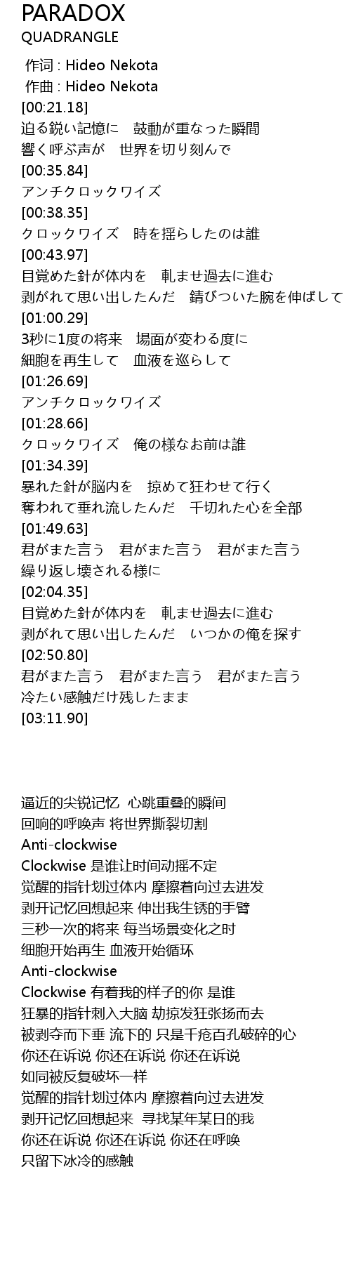 | [00:38.87] | クロックワイズ 時を揺らしたのは誰 |