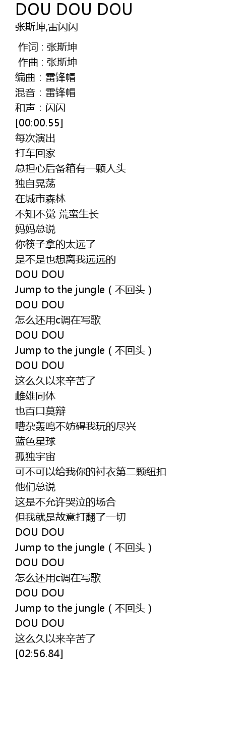 | [02:43.77] | Jump to the jungle bù huí tóu |