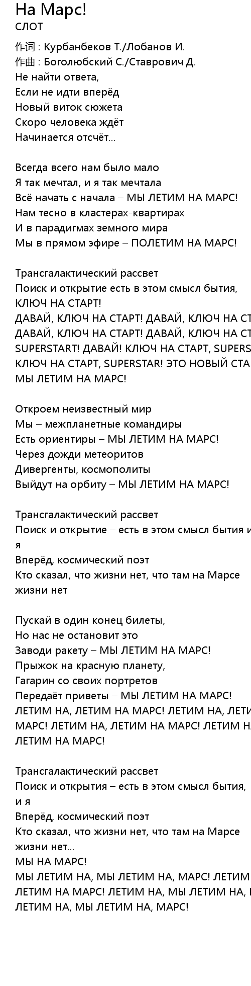ЛЕТИМ НА, ЛЕТИМ НА МАРС! ЛЕТИМ НА, ЛЕТИМ НА МАРС! ЛЕТИМ НА, ЛЕТИМ НА МАРС! ЛЕТИМ НА, МЫ ЛЕТИМ НА МАРС! |
