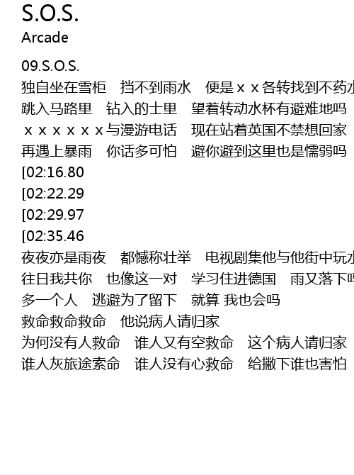 | [01:17.60][02:16.80] | *平时在笑着看着坐着跳着 原来是我在嗌着救命 |