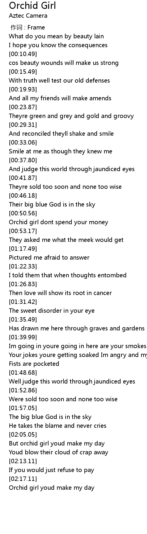 | [00:38.49] | And judge this world through jaundiced eyes |