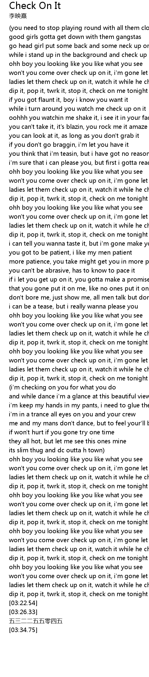 | [01:16.99] | dip it, pop it, twrk it, stop it, check on me tonight |