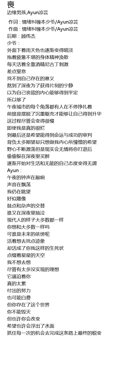 | [00:01.000] | 作曲 : 情绪纠缠本少爷/Ayun凉芸 |