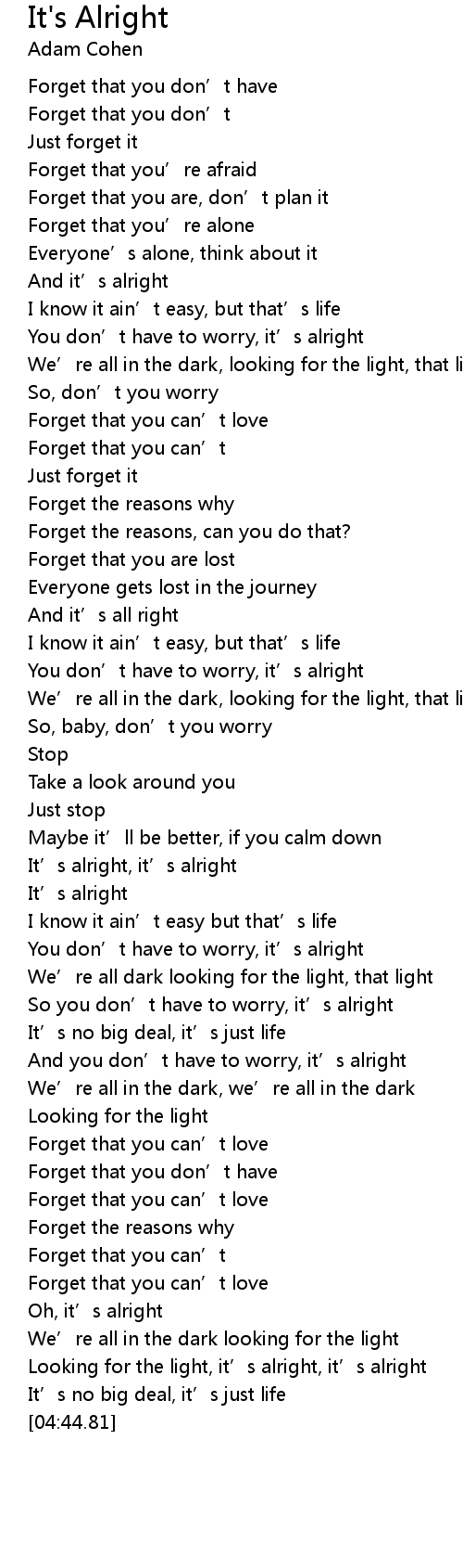 | [04:24.39] | Looking for the light, it' s alright, it' s alright |