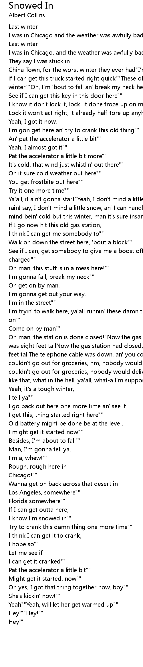 Ya'all, it ain't gonna start"Yeah, I don't mind a little snow, an' I can handle rainI say, I don't mind a little snow, an' I can handle a little rainNow I don't mind bein' cold but this winter, man it's sure insane"