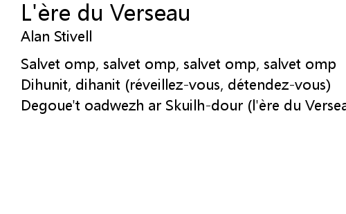| Degoue't oadwezh ar Skuilh-dour (l'ère du Verseau est arrivée) |