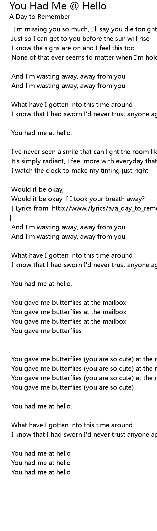 [ Lyrics from: http://www./lyrics/a/a_day_to_remember/you_had_me_at_hello.html ]