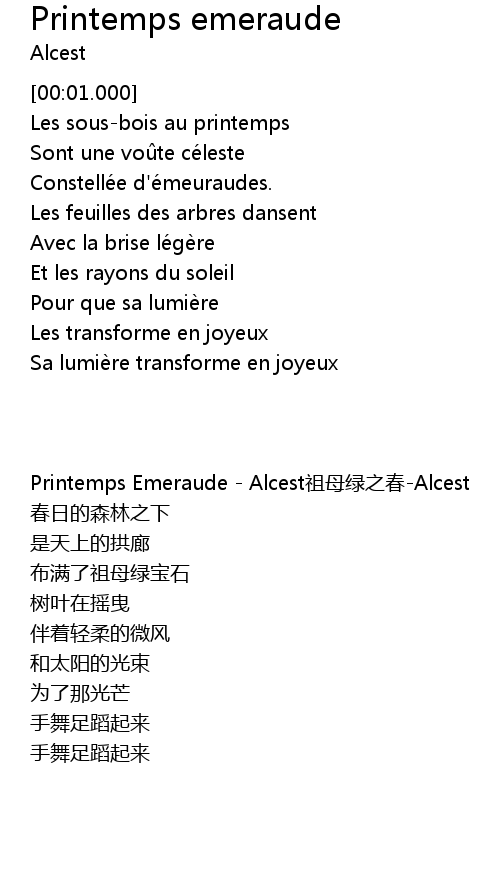 | [00:01.000] | Printemps Emeraude - Alcest祖母绿之春-Alcest |
