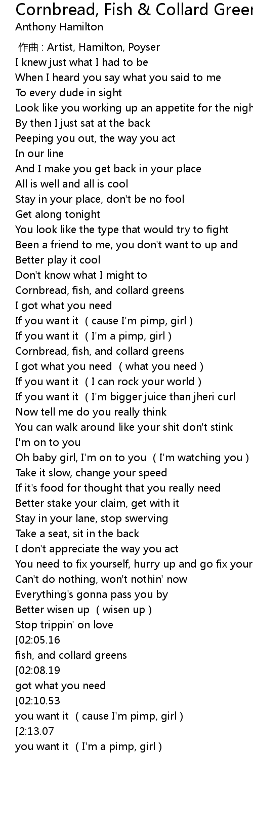 | [00:57.38] | Cornbread, fish, and collard greens |