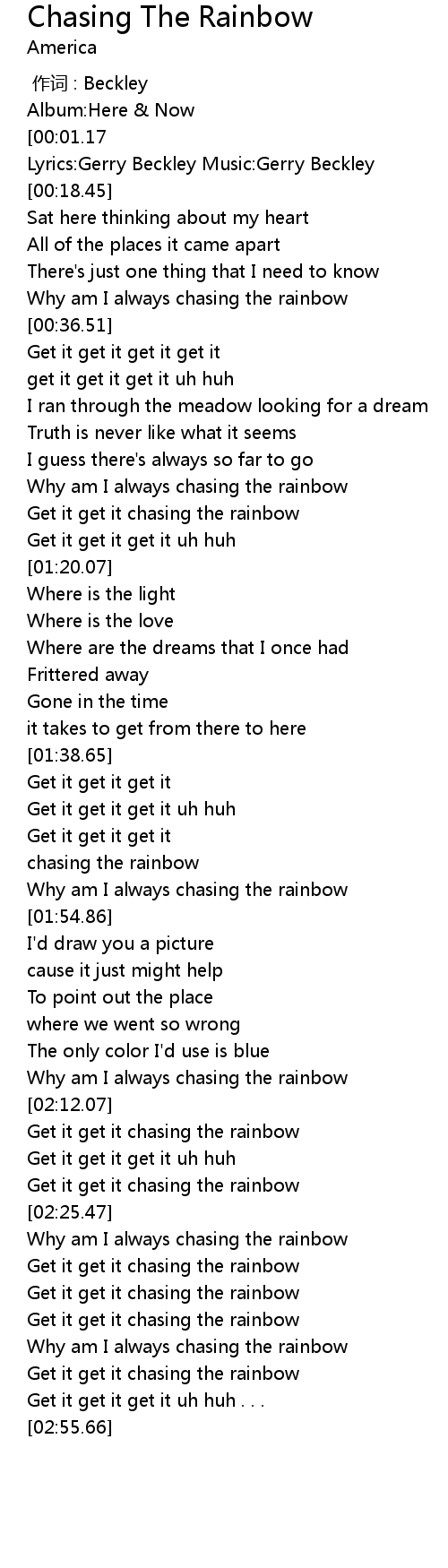 | [02:42.66] | Why am I always chasing the rainbow |
