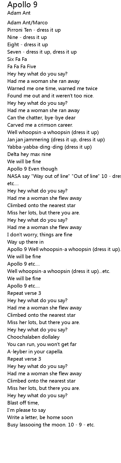 | Apollo 9 Well whoopsin-a whoopsin (dress it up)...etc. | |