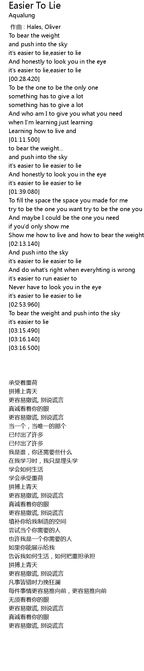 | [02:17.290] | it' s easier to lie easier to lie |