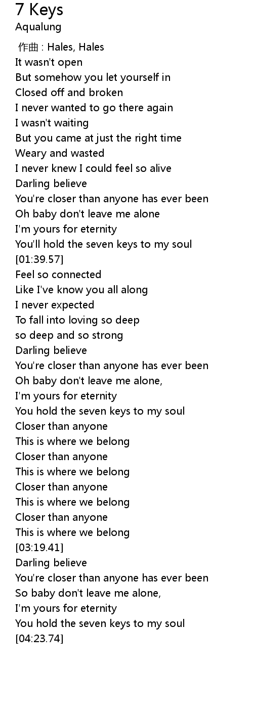 | [01:29.08] | You'll hold the seven keys to my soul |