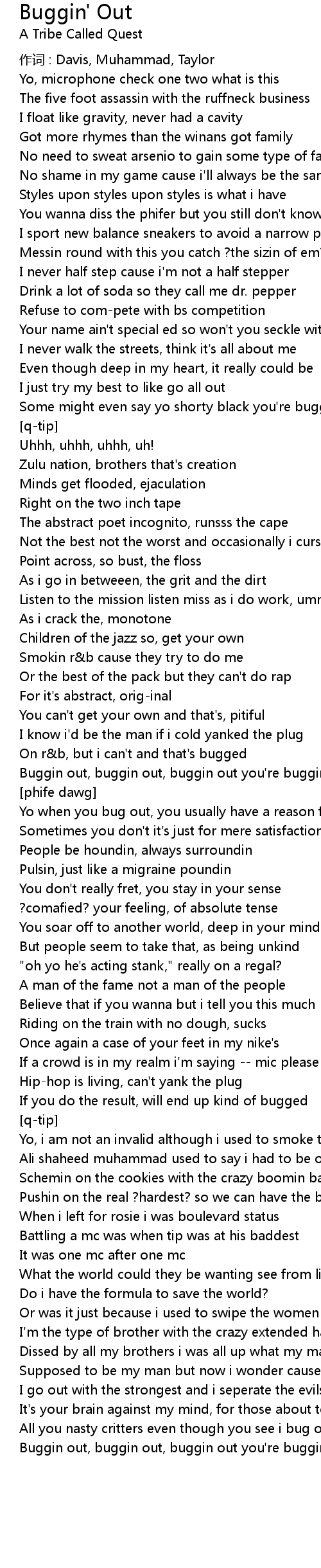 | Buggin out, buggin out, buggin out you're buggin out (repeat 8x) |