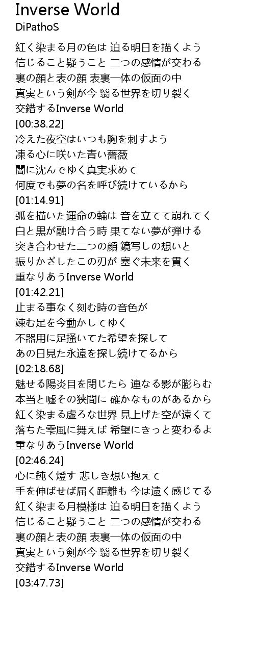 | [00:23.50] | 裏の顔と表の顔 表裏一体の仮面の中 |