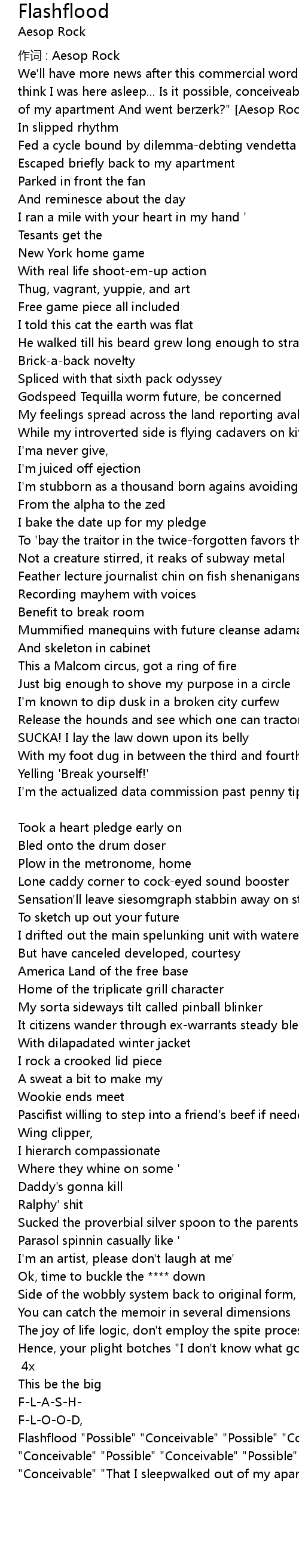 | Flashflood "Possible" "Conceivable" "Possible" "Conceivable" "Possible" "Conceivable" "Possible" "Conceivable" "Possible" "Conceivable" "Possible" "Conceivable" "That I sleepwalked out of my apartment and went berzerk? |