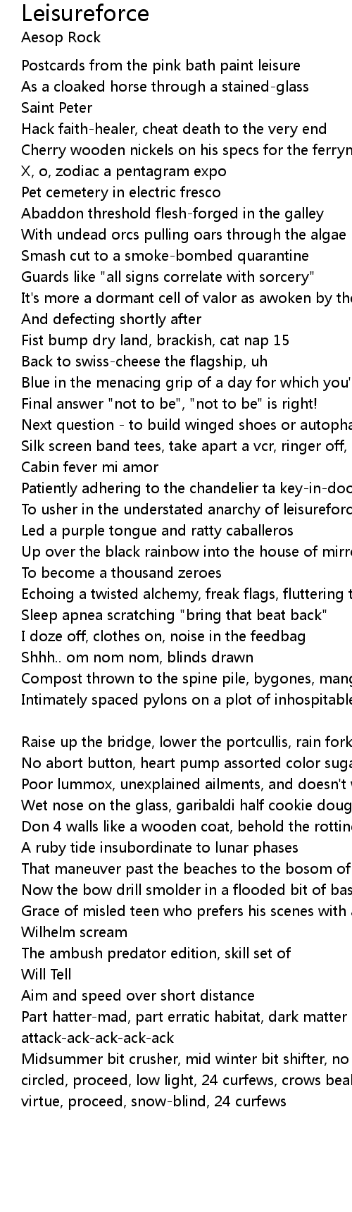 Midsummer bit crusher, mid winter bit shifter, no sleep, gold mine, front door circled, proceed, low light, 24 curfews, crows beak, cold night, unmoored virtue, proceed, snow-blind, 24 curfews
