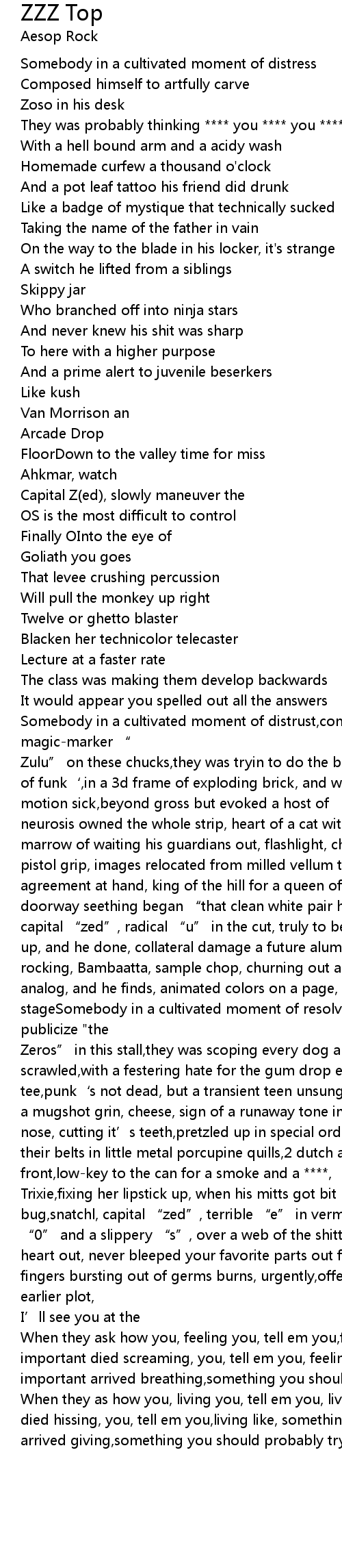 | Trixie, fixing her lipstick up, when his mitts got bit by the mischief bug, snatchl, capital " zed", terrible " e" in vermillion red, gimme an " 0" and a slippery " s", over a web of the shittiest bands, that beat your heart out, never bleeped your favorite parts out from a learned curve, of bird fingers bursting out of germs burns, urgently, offered through the circuits ofan earlier plot, | |