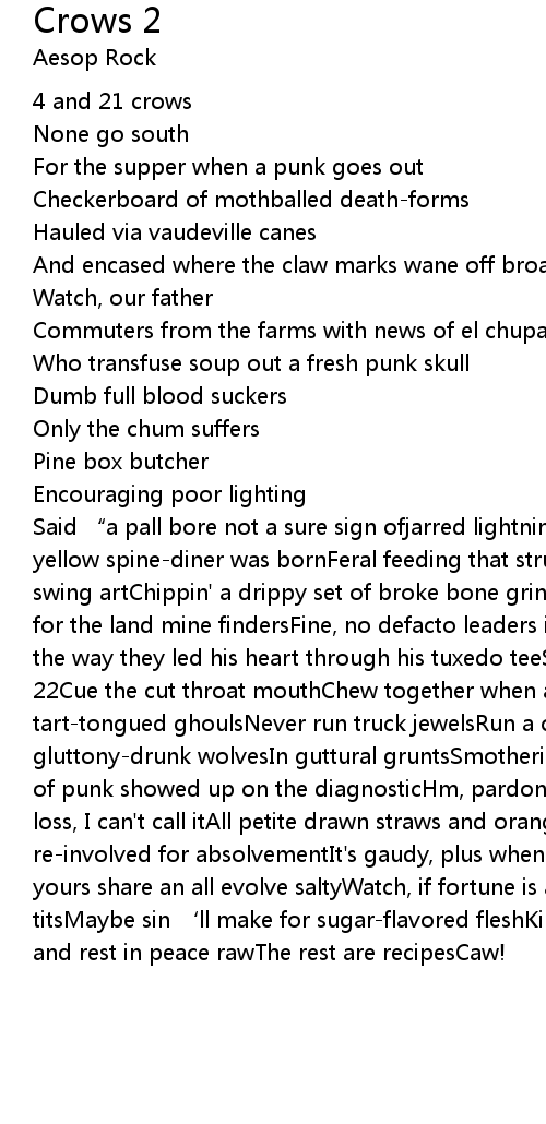 | Said " a pall bore not a sure sign ofjarred lightning" Harsh, that' s how the yellow spinediner was bornFeral feeding that strung his organs up like tire swing artChippin' a drippy set of broke bone grindersMore for the hive mindLess for the land mine findersFine, no defacto leaders in the eateryUnless you count the way they led his heart through his tuxedo teeStraight out the front4 and 22Cue the cut throat mouthChew together when a punk goes outEtiquette of tarttongued ghoulsNever run truck jewelsRun a culinary school for gluttonydrunk wolvesIn guttural gruntsSmothering buttery lung ramenEarly sign of punk showed up on the diagnosticHm, pardon if I seem stand all the seesawed loss, I can' t call itAll petite drawn straws and orange cautionOr outcast creeps reinvolved for absolvementIt' s gaudy, plus when a hellbound offspring and yours share an all evolve saltyWatch, if fortune is a bitch with venom and laser titsMaybe sin ' ll make for sugarflavored fleshKings taste terrible at best and rest in peace rawThe rest are recipesCaw! |