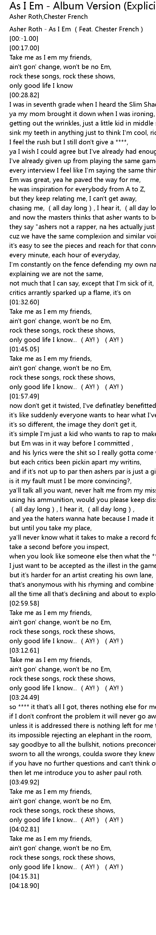 | [00:-2.00] | Asher Roth - As I Em (Feat. Chester French) |