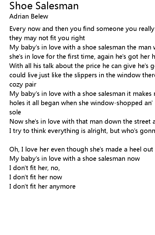 My baby's in love with a shoe salesman it makes me feel like a sock full of holes it all began when she window-shopped an' pretty soon he was holding her sole |