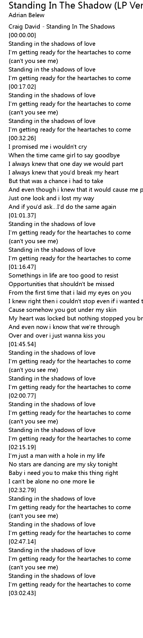 | [00:18.02] | Standing in the shadows of love |