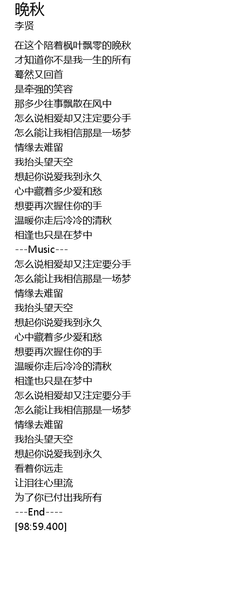 | [00:24.940] | 在这个陪着枫叶飘零的晚秋 |