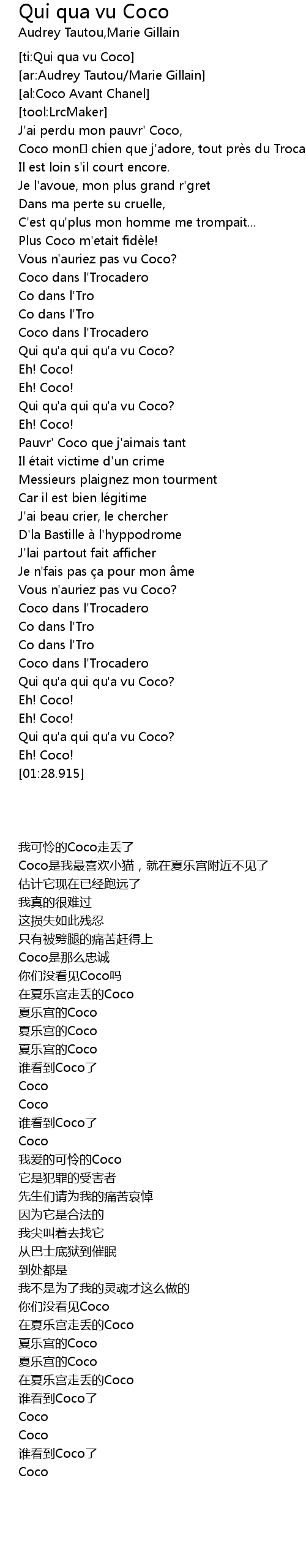 | [00:43.770] | Qui qu'a qui qu'a vu Coco? |