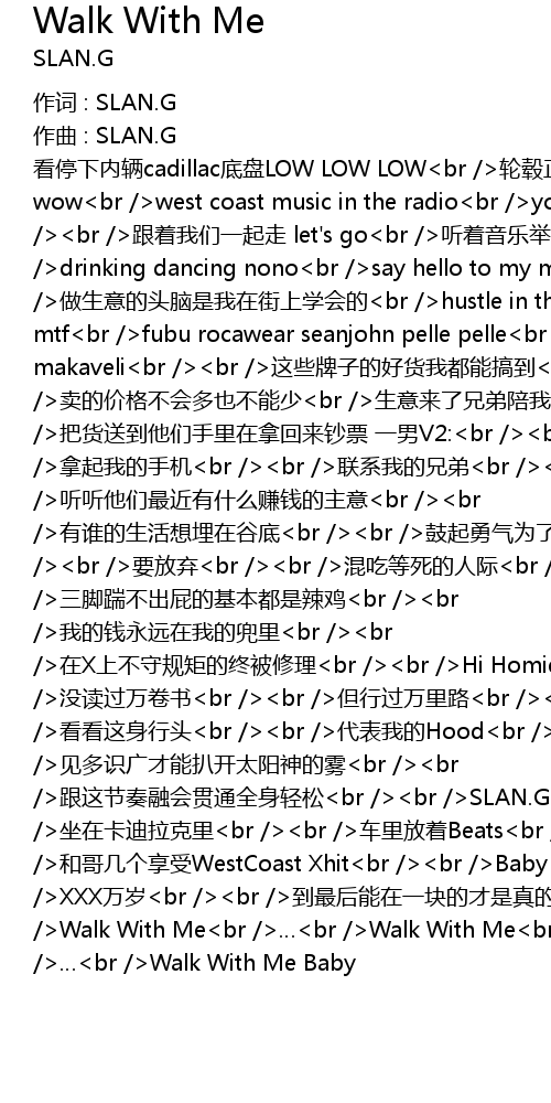 | 看停下内辆cadillac底盘LOW LOW LOW<br />轮毂正在闪闪发光wow wow wow<br />west coast music in the radio<br />yo!what this logo? chinoloco<br /><br />跟着我们一起走 let's go<br />听着音乐举着手 hey girl<br />drinking dancing nono<br />say hello to my money hello hello<br /><br />做生意的头脑是我在街上学会的<br />hustle in the street every day mtf<br />fubu rocawear seanjohn pelle pelle<br />phatfarm enyce lrg coogi makaveli<br /><br />这些牌子的好货我都能搞到<br />卖的价格不会多也不能少<br />生意来了兄弟陪我走一遭<br />把货送到他们手里在拿回来钞票 一男V2:<br /><br />拿起我的手机<br /><br />联系我的兄弟<br /><br />听听他们最近有什么赚钱的主意<br /><br />有谁的生活想埋在谷底<br /><br />鼓起勇气为了它毫无顾忌<br /><br />要放弃<br /><br />混吃等死的人际<br /><br />三脚踹不出屁的基本都是辣鸡<br /><br />我的钱永远在我的兜里<br /><br />在X上不守规矩的终被修理<br /><br />Hi Homie<br /><br />没读过万卷书<br /><br />但行过万里路<br /><br />看看这身行头<br /><br />代表我的Hood<br /><br />见多识广才能扒开太阳神的雾<br /><br />跟这节奏融会贯通全身轻松<br /><br />SLAN.G<br /><br />坐在卡迪拉克里<br /><br />车里放着Beats<br /><br />和哥几个享受WestCoast Xhit<br /><br />Baby Ya Know Me<br /><br />XXX万岁<br /><br />到最后能在一块的才是真的兄弟<br /><br />Walk With Me<br />…<br />Walk With Me<br />…<br />Walk With Me Homie<br />…<br />Walk With Me Baby |