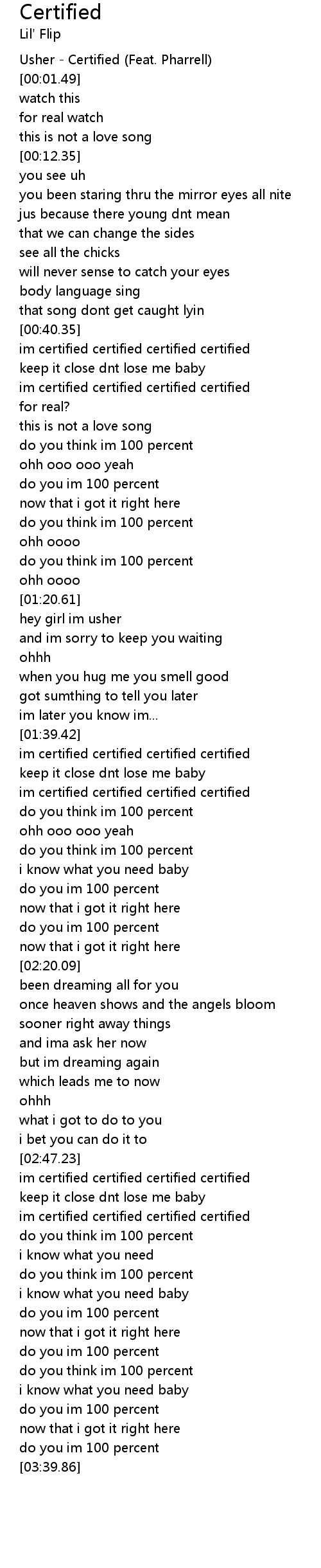 | [00:00.39] | Usher - Certified (Feat. Pharrell) |