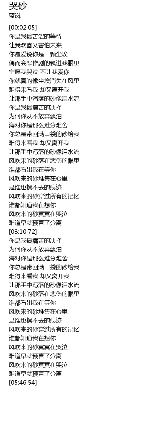 | [05:10.85] | 风吹来的砂冥冥在哭泣 |