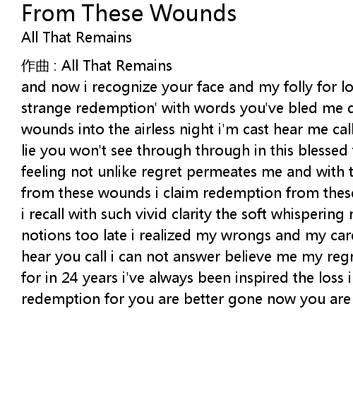 | and now i recognize your face and my folly for longer days and nights this strange redemption' with words you' ve bled me dry now dust falls from these wounds into the airless night i' m cast hear me call you i know i can' t create a lie you won' t see through through in this blessed tone i am a child in wanting a feeling not unlike regret permeates me and with the birth of fear i am set free from these wounds i claim redemption from these wounds i am redeemed in passing i recall with such vivid clarity the soft whispering reminders of foolish notions too late i realized my wrongs and my carelessness now from the stone i hear you call i can not answer believe me my regret runs deep yet i know peace for in 24 years i' ve always been inspired the loss i do regret and still i know redemption for you are better gone now you are set free |