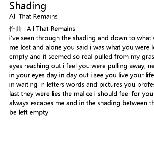 | i've seen through the shading and down to what's within reaching you will feel me lost and alone you said i was what you were looking for so why do i feel so empty and it seemed so real pulled from my grasp taken away am i nothing in your eyes reaching out i feel you were pulling away, never letting me in i am nothing in your eyes day in day out i see you live your life again a fool i stand here in waiting in letters words and pictures you profess your love to me and to the last they were lies the malice i should feel for you deceitfulness some how always escapes me and in the shading between the words you said to me i know i'd be left empty |