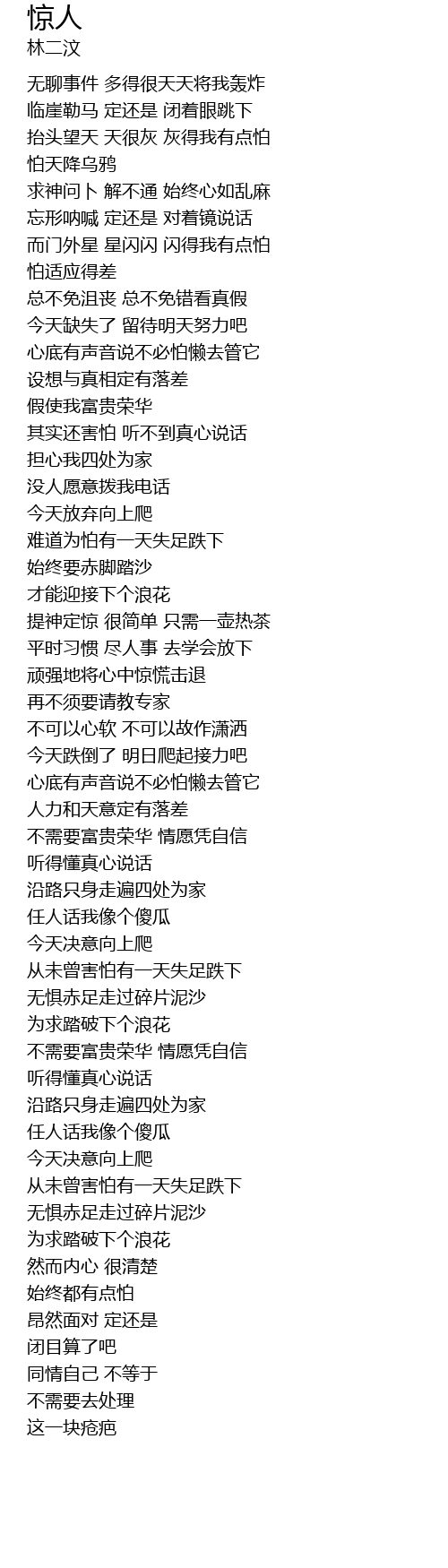 | [00:22.940] | tái tóu wàng tiān tiān hěn huī huī dé wǒ yǒu diǎn pà |