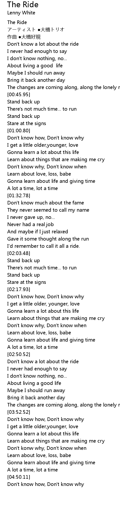 | [03:22.87] | Don't know a lot about the ride |