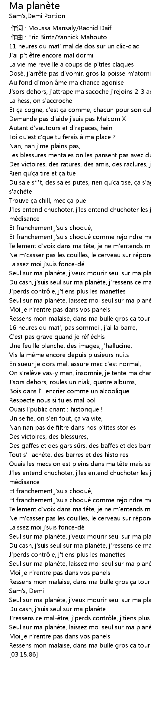 | [03:06.76] | Seul sur ma planè te, laissez moi seul sur ma planè te |