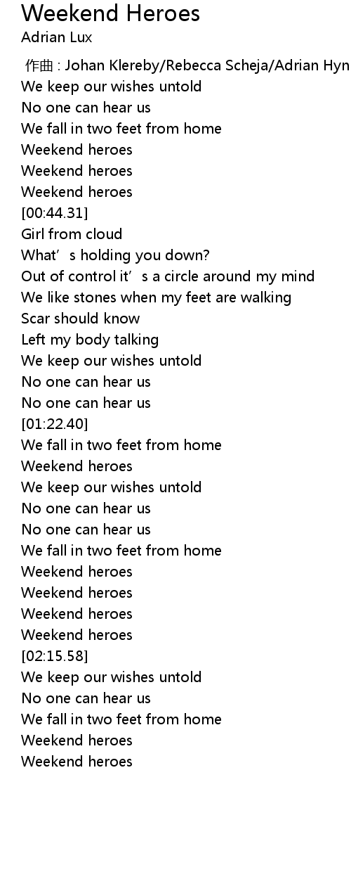 | [00:00.000] | zuo qu : Johan Klereby Rebecca Scheja Adrian Hynne |