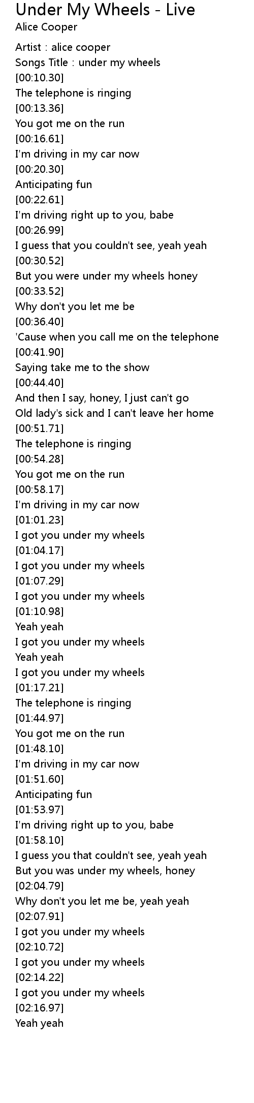 | [02:09.04] | I got you under my wheels |