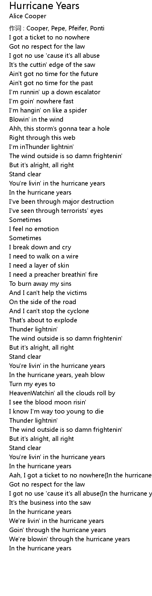 | Aah, I got a ticket to no nowhere(In the hurricane years) | |
