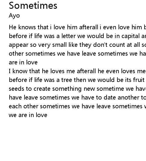 | I know that he loves me afterall he even loves me better so much more than before if life was a tree then we would be its fruit and we will spread our seeds to create something new sometime we have to hurt each other sometimes we have leave sometimes we have to date another to realise sometime we have to hurt each other sometimes we have leave sometimes we have to date another to realise we are in love |