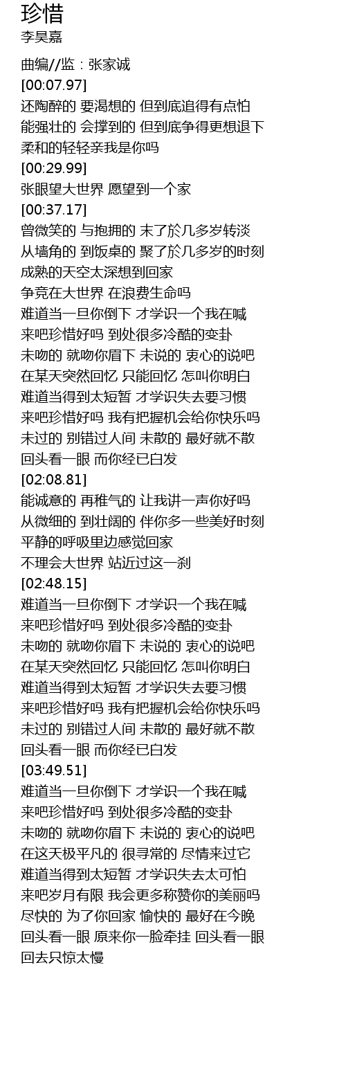 | [01:15.05] | 来吧珍惜好吗 到处很多冷酷的变卦 |