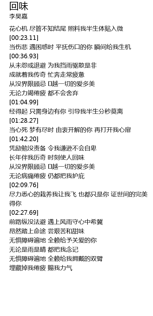 | [00:11.85] | 花心机 尽管不知结尾 照料我半生体贴入微 |