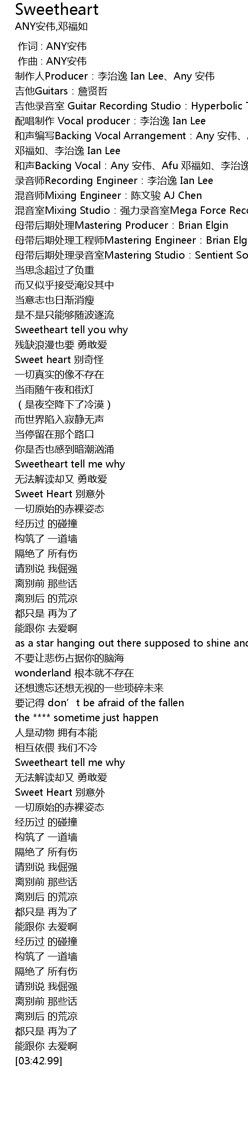| [00:06.05] | he sheng Backing Vocal: Any an wei Afu deng fu ru li zhi yi Ian Lee |