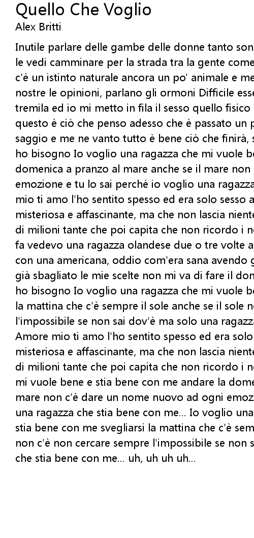 | le vedi camminare per la strada tra la gente come fosse niente però nell'uomo c'è un istinto naturale ancora un po' animale e mentre ci illudiamo siano nostre le opinioni, parlano gli ormoni Difficile essere uomo alle soglie del tremila ed io mi metto in fila il sesso quello fisico ormai non ha più senso e questo è ciò che penso adesso che è passato un po' tempo adesso son più saggio e me ne vanto tutto è bene ciò che finirà, se mi va, adesso so di cosa ho bisogno Io voglio una ragazza che mi vuole bene e stia bene con me andare la domenica a pranzo al mare anche se il mare non c'è dare un nome nuovo ad ogni emozione e tu lo sai perché io voglio una ragazza che stia bene con me... Amore mio ti amo l'ho sentito spesso ed era solo sesso attratto da una forza misteriosa e affascinante, ma che non lascia niente le storie sono tante milioni di milioni tante che poi capita che non ricordo i nomi uh, uh uh uh... Un anno fa vedevo una ragazza olandese due o tre volte al mese andavo a far ginnastica con una americana, oddio com'era sana avendo già provato mille volte avendo già sbagliato le mie scelte non mi va di fare il dongiovanni adesso so di cosa ho bisogno Io voglio una ragazza che mi vuole bene e stia bene con me svegliarsi la mattina che c'è sempre il sole anche se il sole non c'è non cercare sempre l'impossibile se non sai dov'è ma solo una ragazza che stia bene con me... Amore mio ti amo l'ho sentito spesso ed era solo sesso attratto da una forza misteriosa e affascinante, ma che non lascia niente le storie sono tante milioni di milioni tante che poi capita che non ricordo i nomi Io voglio una ragazza che mi vuole bene e stia bene con me andare la domenica a pranzo al mare anche se il mare non c'è dare un nome nuovo ad ogni emozione e tu lo sai perché io voglio una ragazza che stia bene con me... Io voglio una ragazza che mi vuole bene e stia bene con me svegliarsi la mattina che c'è sempre il sole anche se il sole non c'è non cercare sempre l'impossibile se non sai dov'è ma solo una ragazza che stia bene con me... uh, uh uh uh... |