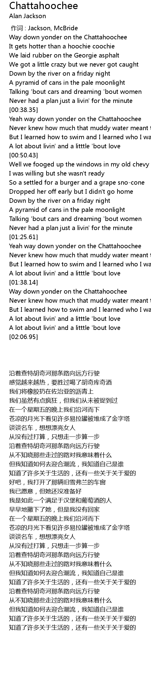 | [00:15.93] | Way down yonder on the Chattahoochee |